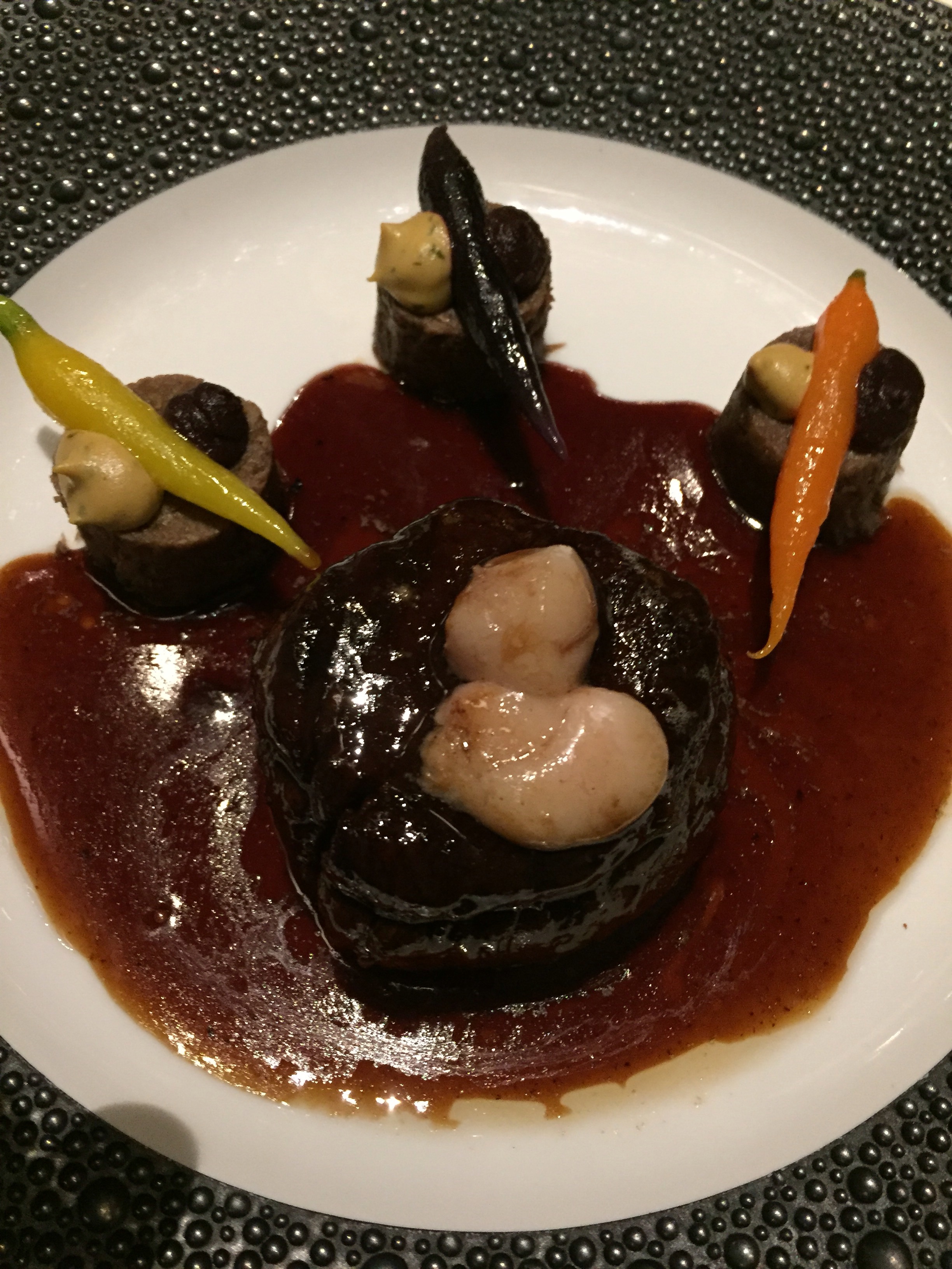 We started with a glass of Varnier Fanniere Grand Cru Rose which was really delicious. It had a unique depth of flavor I have never had in a champagne before. I don’t know much about champagne to be honest, and we never really love it, we just decided to go for it because of the night and because of the extravagant champagne cart they brought it out on. So glad we did, it was just delicious. I may try and find another bottle.